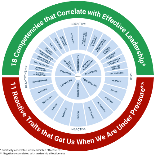 The lower half of the circle describes a set of traits or behaviours that leaders can slide into when they react under pressure. In many ways, we are programmed for these and slip into the mode without knowing it. These limiting tendencies each hold assumptions about what works: gaining the approval of others, protecting my ideas or self-image, or winning results regardless of the cost. These traits are negatively correlated with leadership effectiveness.